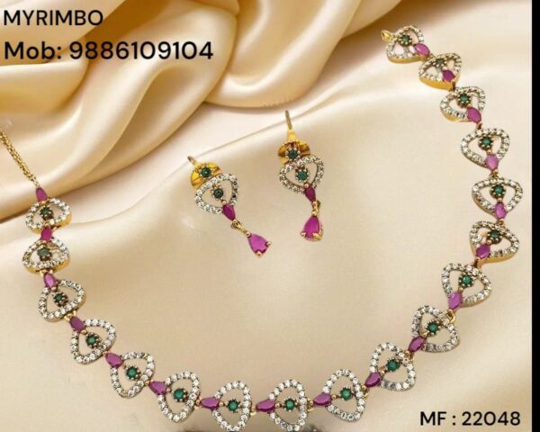 - Elevate your elegance with the “Ruby & Emerald Heart Symphony” jewelry set. This enchanting ensemble features a delicately crafted necklace of interlocking, heart‑shaped links—each outlined in dazzling clear cubic zirconia and accented with a rich ruby‑tone marquise stone leading to a vibrant emerald‑tone center.